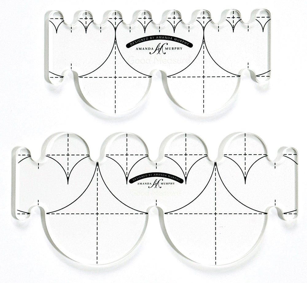This set of two rulers makes an easy and classic allover pattern. It can produce 1”, 2”, 3”, and 4” clamshells respectively. The great thing about these rulers is that, when you move from one row of clamshells to the next, the lines on the ruler will line up right on top of your previous row of stitching for perfect placement with no marking!